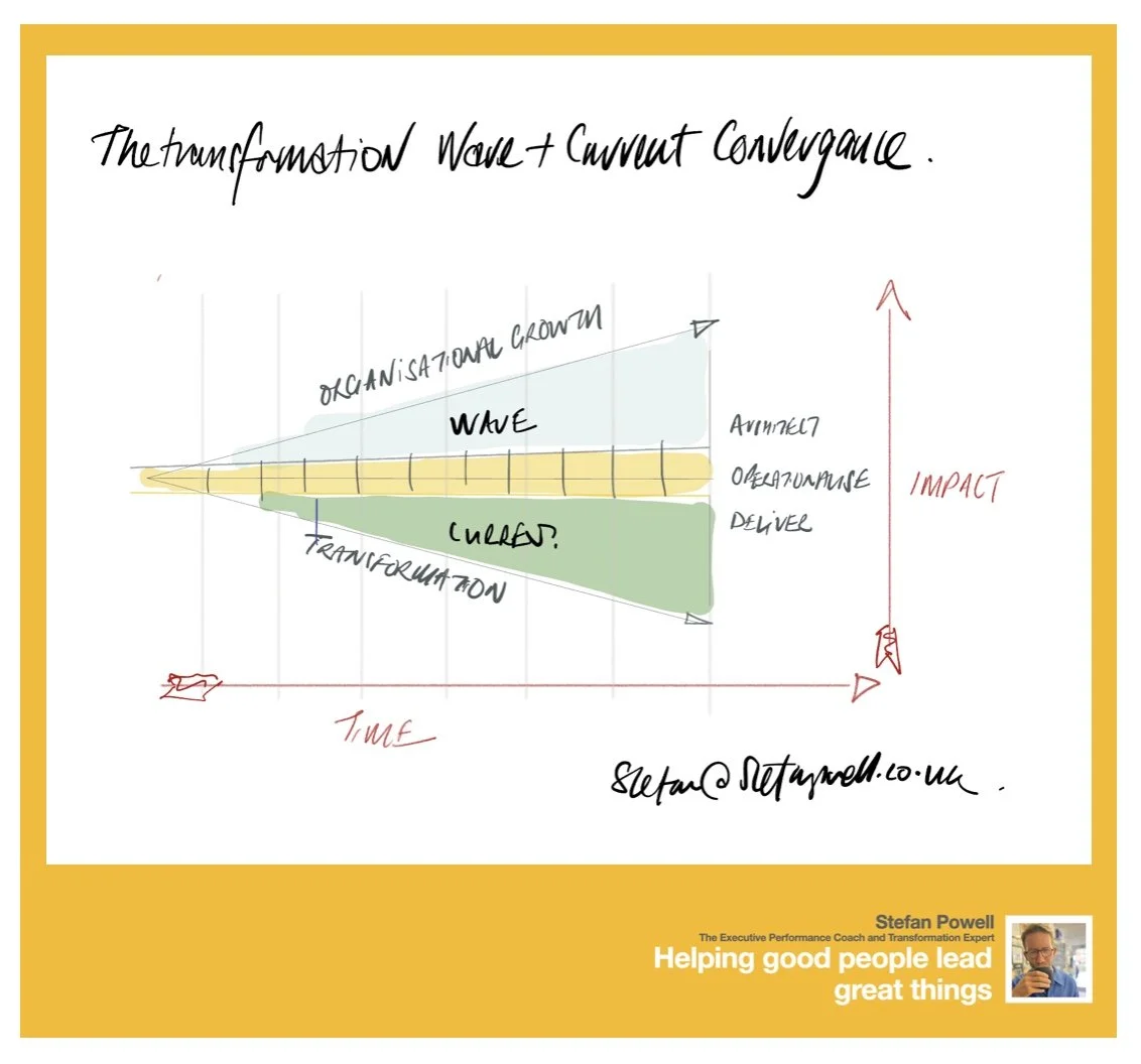 Once you can see the Wave - Current Convergence, it opens up practical ways to navigate transformation. For example, I often work with leaders to map out the phases of a whole year’s worth of change, particularly the first year, aligning what must be delivered with what must be transformed. The model makes these discussions tangible: you can visualise priorities, sequence actions, and understand the dependencies between short-term growth and long-term transformation.