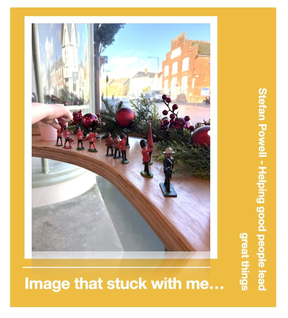 Toy soldiers, lined up on a windowsill after a charity shop amble with Vera, lined up in the window of a coffee shop.